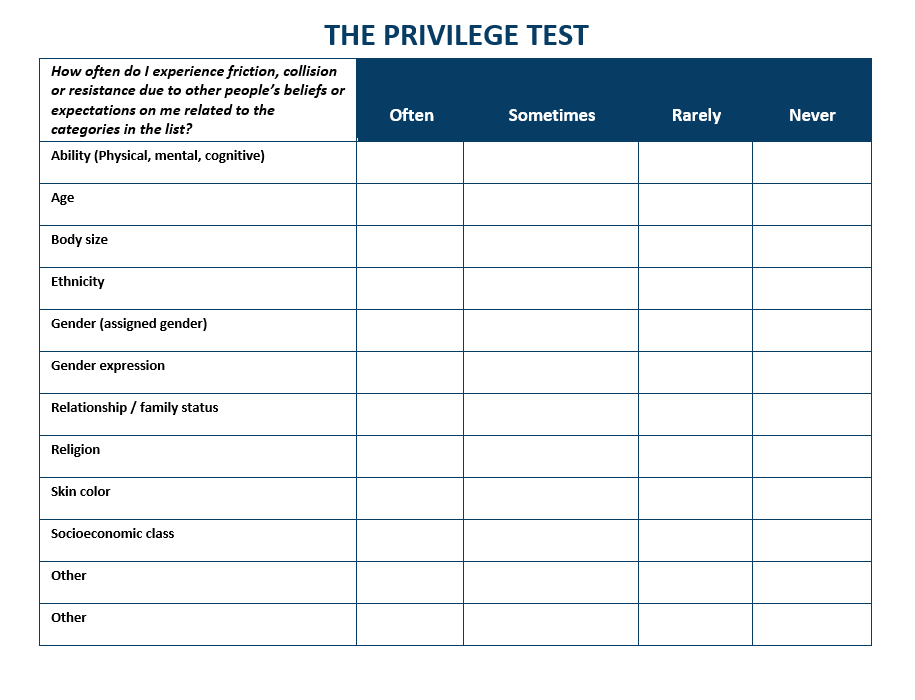 All people in society are affected by norms and power. One way to see power in everyday situations can be to make visible the privileges and advantages assigned to those who belong to the norm in different ways. As a local government official, becoming aware of your own relationship to norms, power, and privileges, can make it easier to understand your own role in the practical work for equal rights. The Privilege Test, as we refer to it, is an adapted version of the Teflon Test, a self-assessment tool created by Louise Andersson in 2004. This version is adapted by Uppsala Antidiscrimination Office on behalf of ICLD. You can do the exercise completely on your own, or do the last part together with your colleagues.