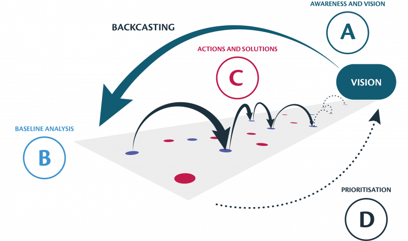 Compared to many other techniques, Backcasting leads to more creative thinking and a greater sense of ownership among those involved in the process. Backcasting was developed in the 1980s and has been widely used in climate work around the world. The method is based on the question: “To achieve a certain goal in the future, what must we do practically today and going forward?”. Backcasting works particularly well where there are ready-made solutions and where the goal is ambitious and requires innovative options and new ideas. Unlike ‘forecasting’, backcasting is not about predicting the future, but about creating forward-looking work plans and exploring challenges.The first step is to determine the desired future. Then the participants work backwards in time step by step to determine what is required to achieve the future vision.
